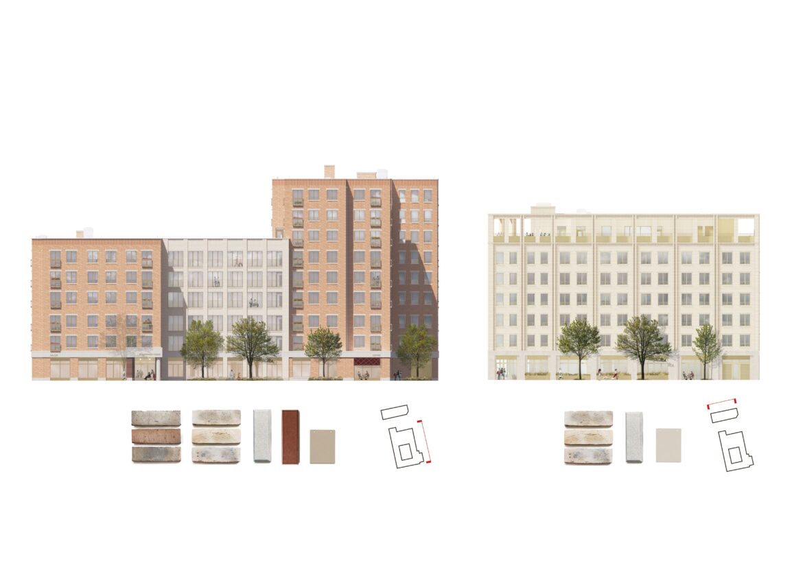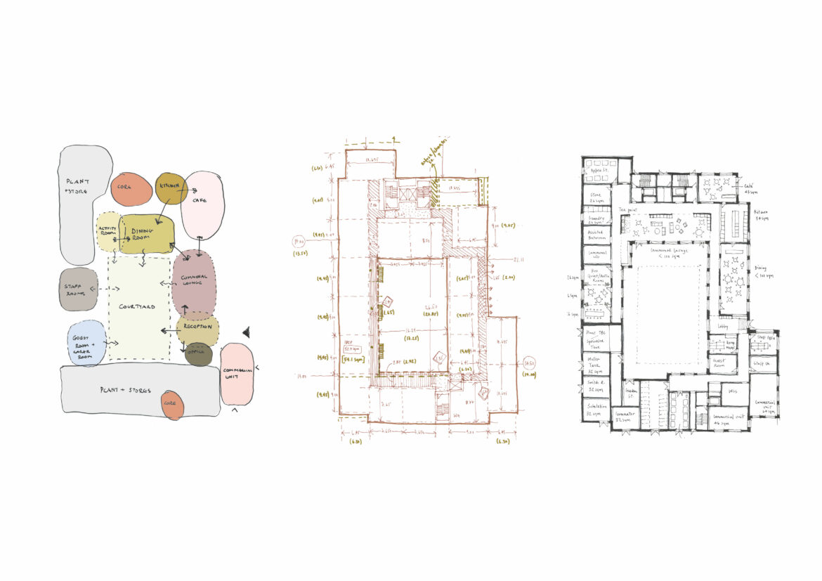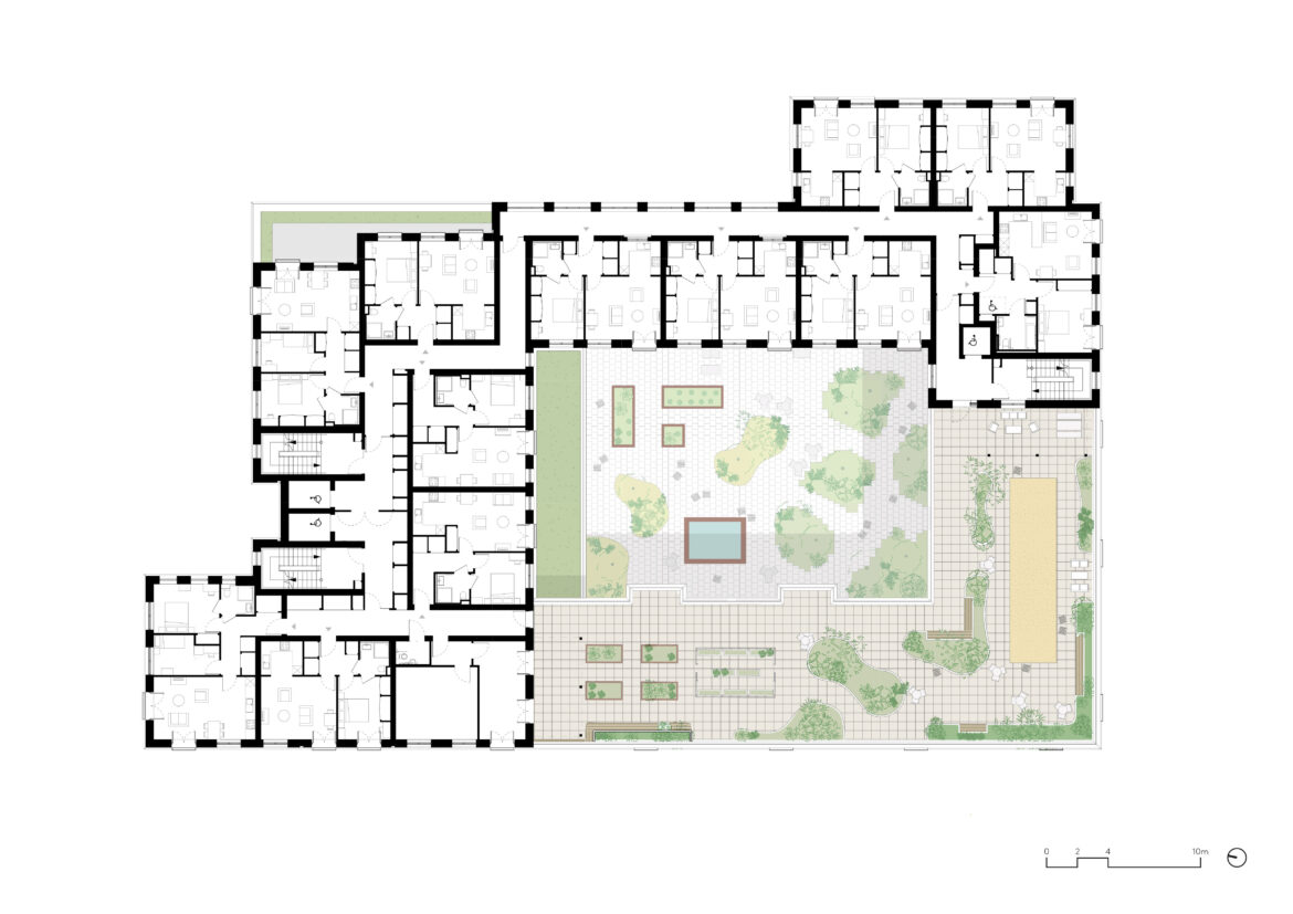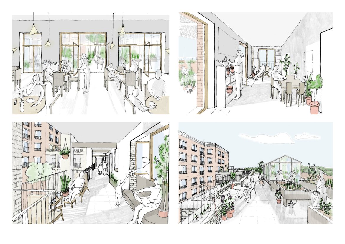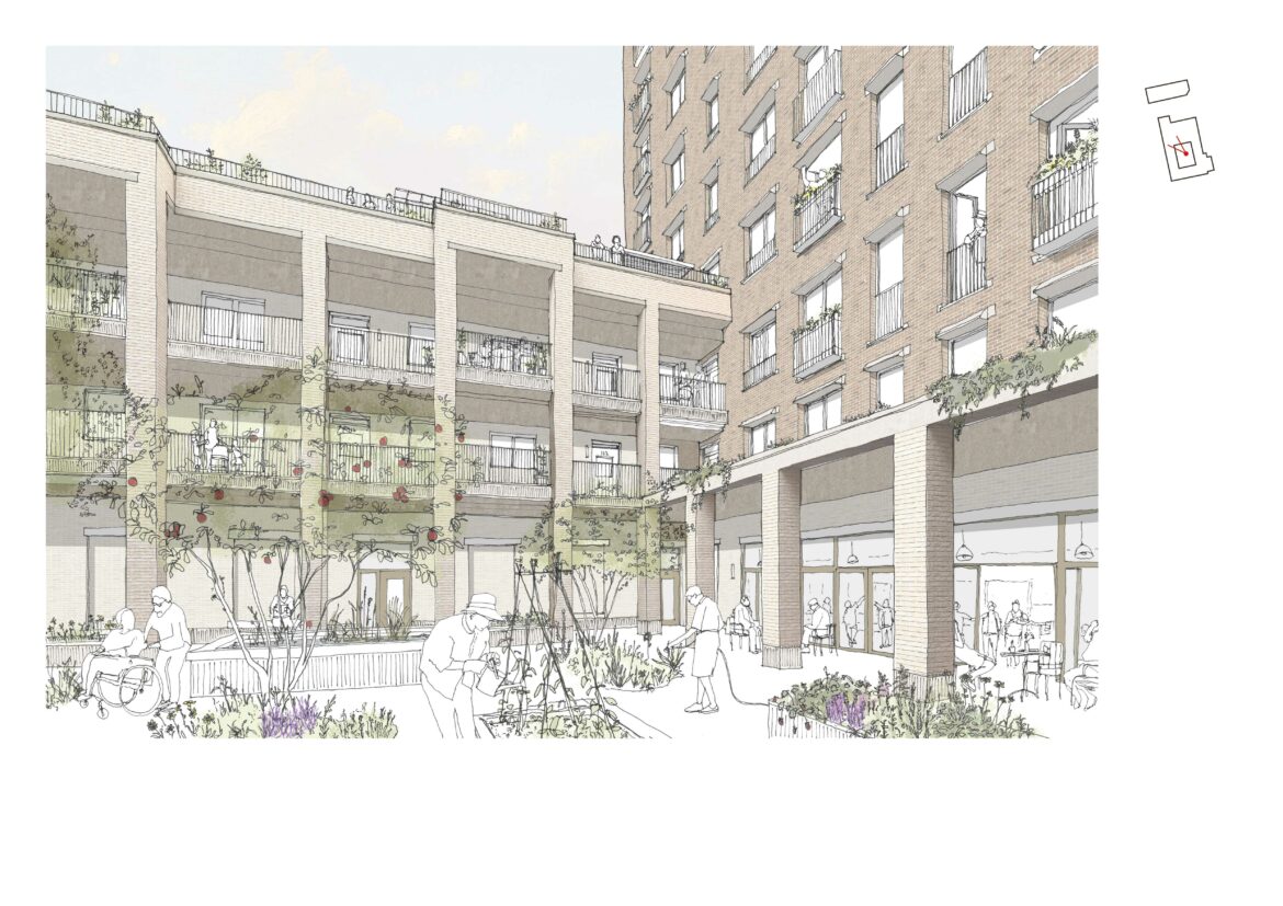 Acting as the gateway to the Town Centre and St Martin’s Square, a new 3 to 9 storey Extra-Care building will sit to the south of the site, now given to pedestrian priority, marked by trees, rain gardens and seating. A glazed brick entrance leads into a lobby and residents’ lounge, and onto a shared courtyard. The integration of quiet outdoor spaces into the building’s plan is continued onto the third-floor terrace, with a greenhouse, raised-bed allotments, shaded canopies and areas for exercise and interaction.