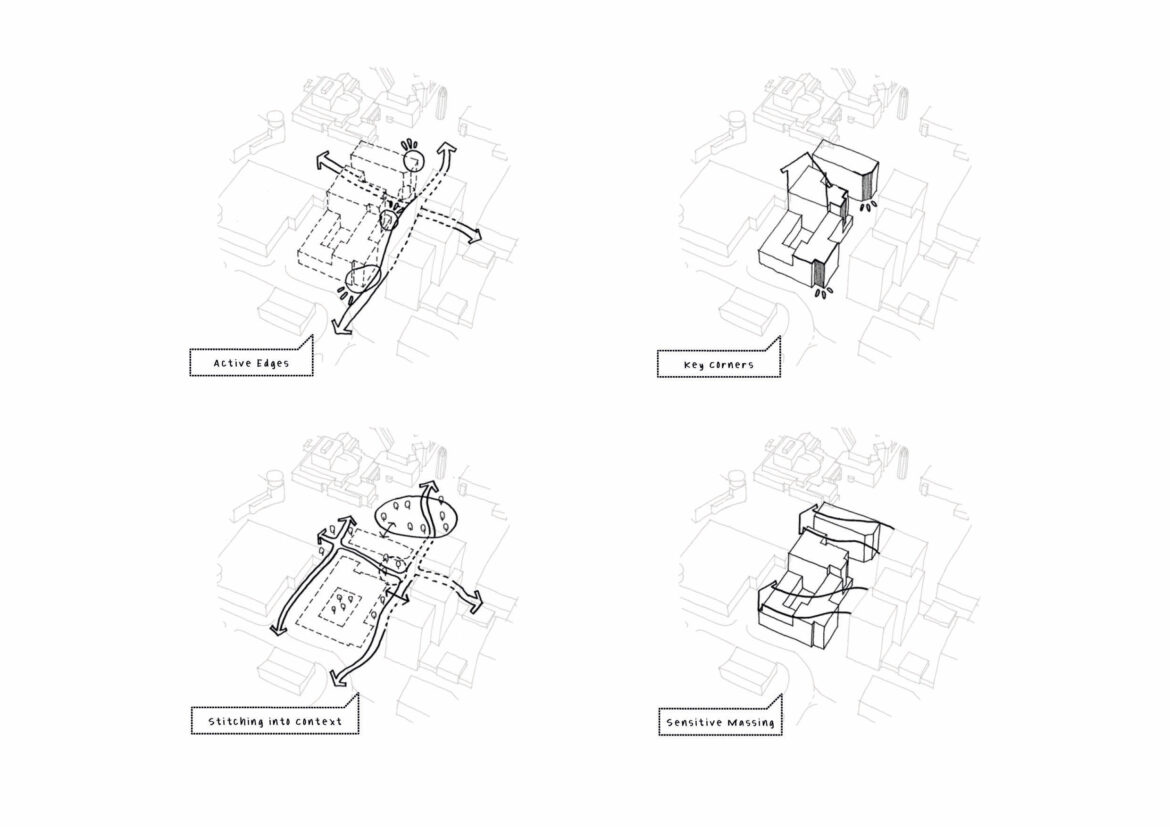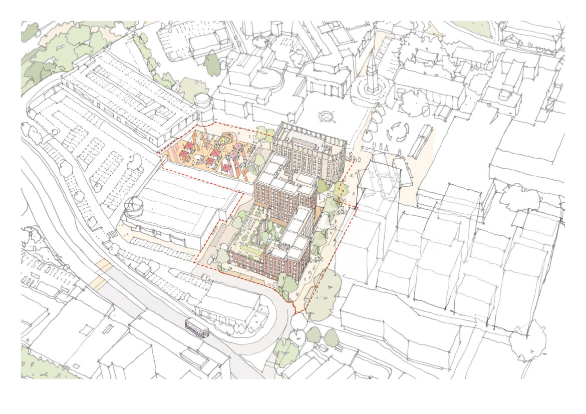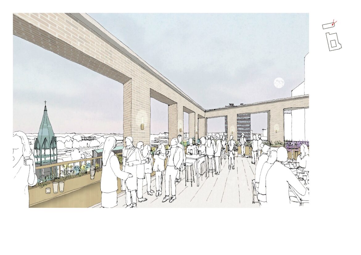 Our proposal also includes the addition of a 7-storey hotel chamfered along Fodderwick, defining the north of the site next to a newly proposed Pocket Square. The simple and elegant building is composed by a rhythm of piers defining each bay, which provides a strong civic frontage to St Martin’s Square and references the language of the adjacent St Martin’s Church. The ground floor offers a public commercial space while a publicly accessible rooftop bar frames views over the Town Centre.