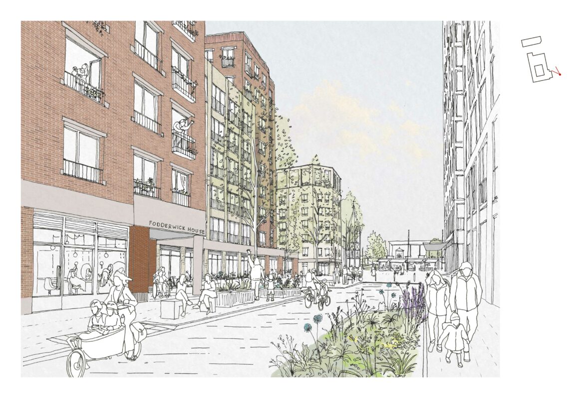 Community and stakeholder engagement played a central role throughout the design process, informing a guiding set of principles and shaping the project’s direction. Conversations with residents and stakeholders highlighted key priorities that would respond to local needs and aspirations. This led to design decisions that focused on improving connections between the Town Square and Fodderwick, expanding green spaces, providing new homes with generous amenity space and introducing new commercial uses within the Town Centre.