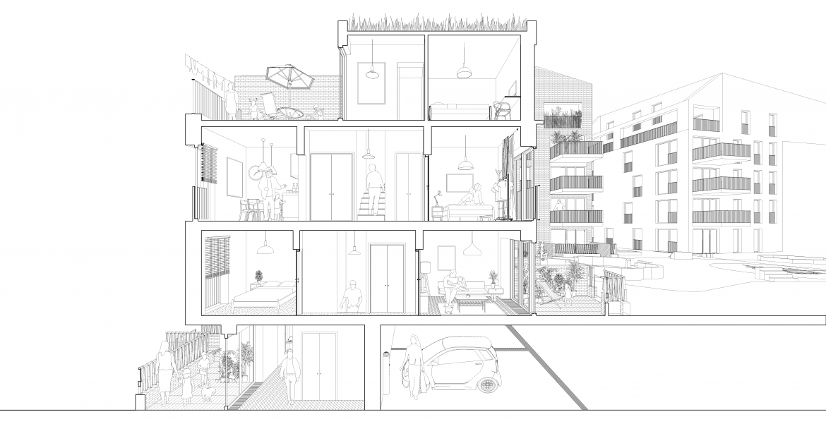 To the south, the building line is broken down into smaller elements to form a residential terrace of homes lining Colville Street. Lowering the building heights in this way ensures light is optimised into the shared courtyard space, residential back gardens and terraces. Spacious dwellings wrap around the outdoor communal courtyard, with gated back gardens opening out to a raised landscape element to create an environment which encourages connections between neighbours.