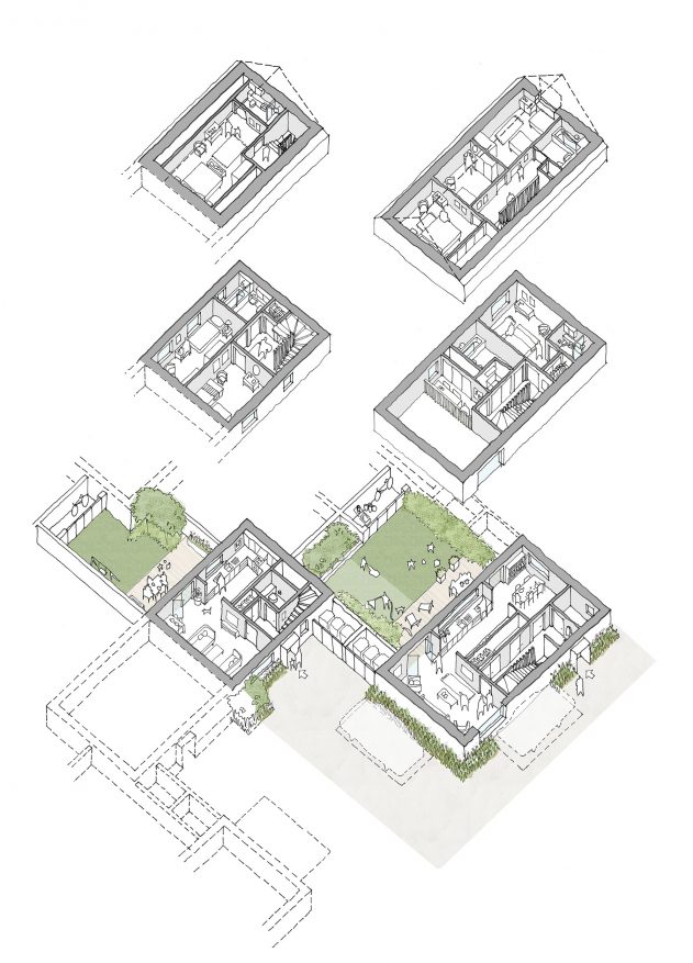 The location of the scheme on Metropolitan Open Land (MOL), as designated by the GLA, required a thoughtful approach in order to retain views and a sense of openness through the site. In response, homes are off-set from one another to form a staggered patchwork arrangement, with dwellings organised between gardens and vehicular yards in a pattern that mimics the layout of nearby allotments.