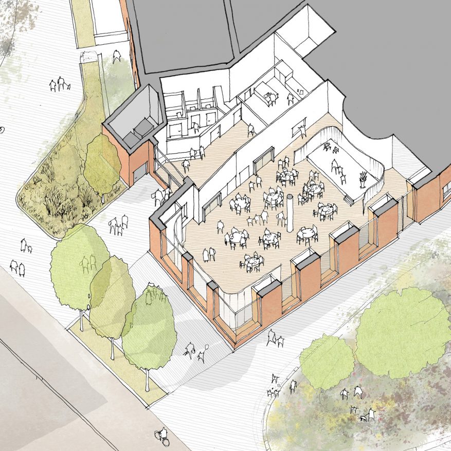 At its east side, at the highly visible approach from the south, is the entrance to the community centre. Here the building line purposefully steps back to create a more expansive public space for people to gather. At its west side, the building tapers into the masterplan and where it meets a prominent junction is articulated by a communal entrance.