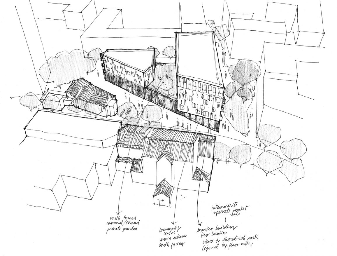 The energy centre is an important component of the project and will connect into the wider CHP district heat network, helping to align with and achieve the climate emergency policies of Hackney Council and the GLA. By elevating the landscaped recreational area, the design creates a feeling of containment and privacy at height for residents, while the break in the building line allows more light to enter Colville Street and the adjacent terrace of homes.