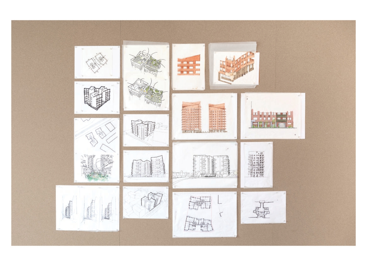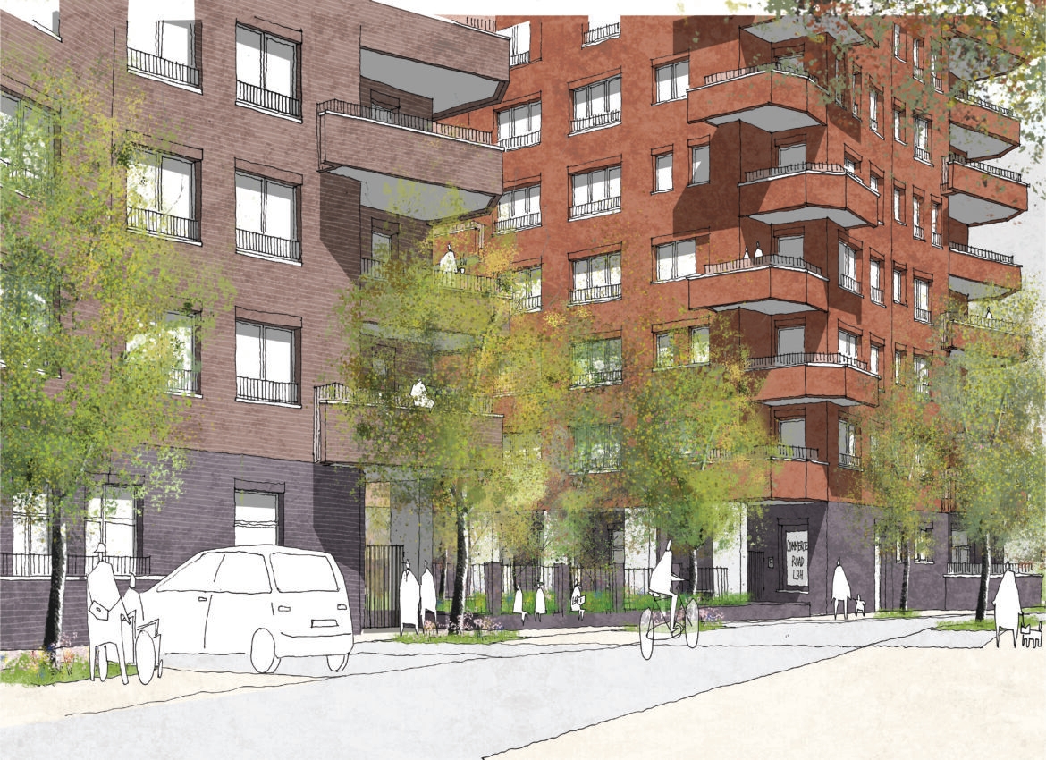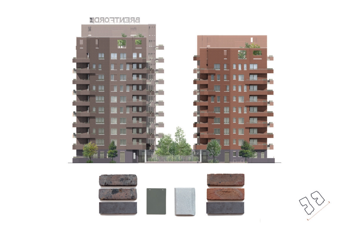 Situated on a tightly constrained site, bordering the Hounslow Loop railway and adjacent bus depot as well as neighbouring blocks of the wider masterplan, the 9 to11 storey russet and brown brick buildings bookend the new car-free residential neighbourhood. Our proposal sensitively responds to its context through massing formed in stepped heights and articulated balconies in sculpted brick.