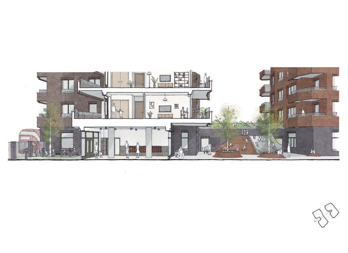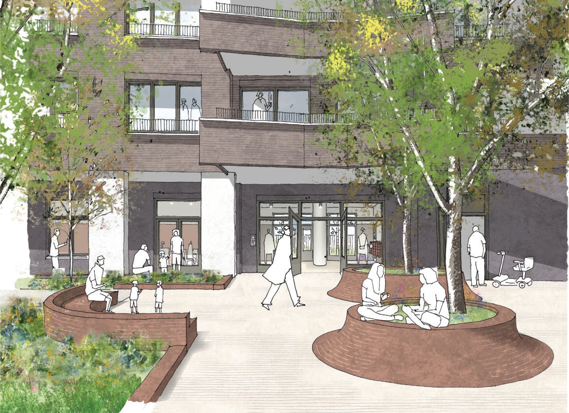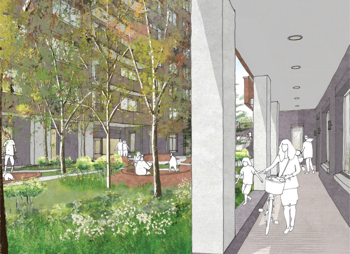 At street level, a generous sequence of amenity spaces, including a new TRA meeting hall, welcomes residents through an architectural colonnade, guiding the route to communal entrances and creating an everyday connection to nature.