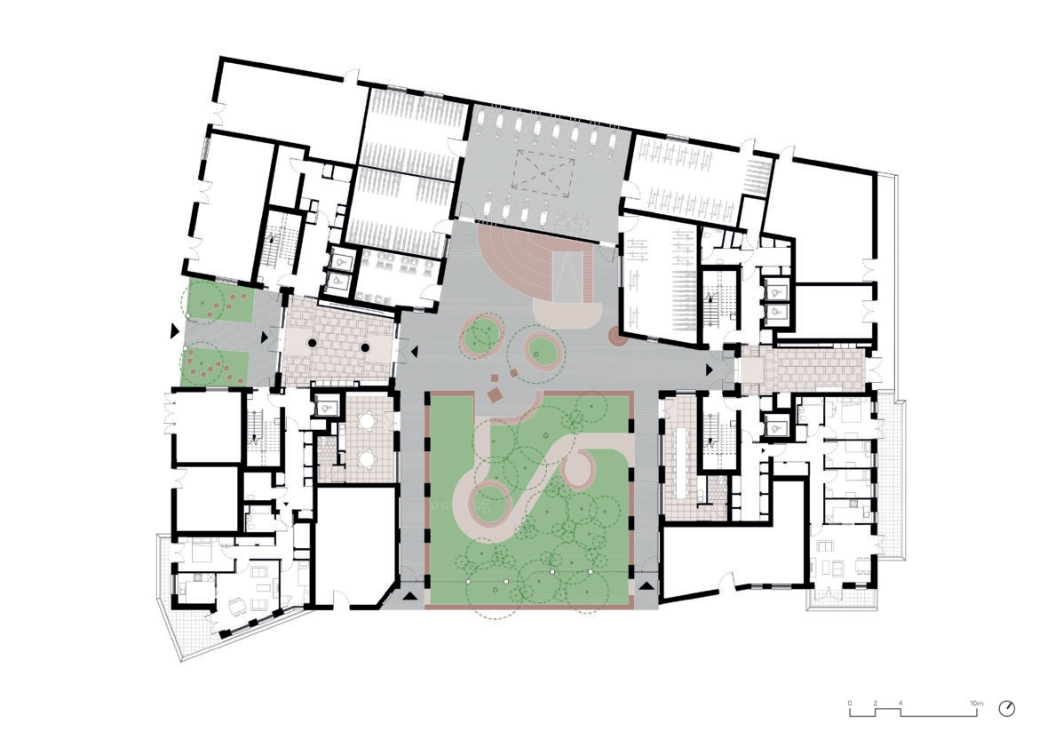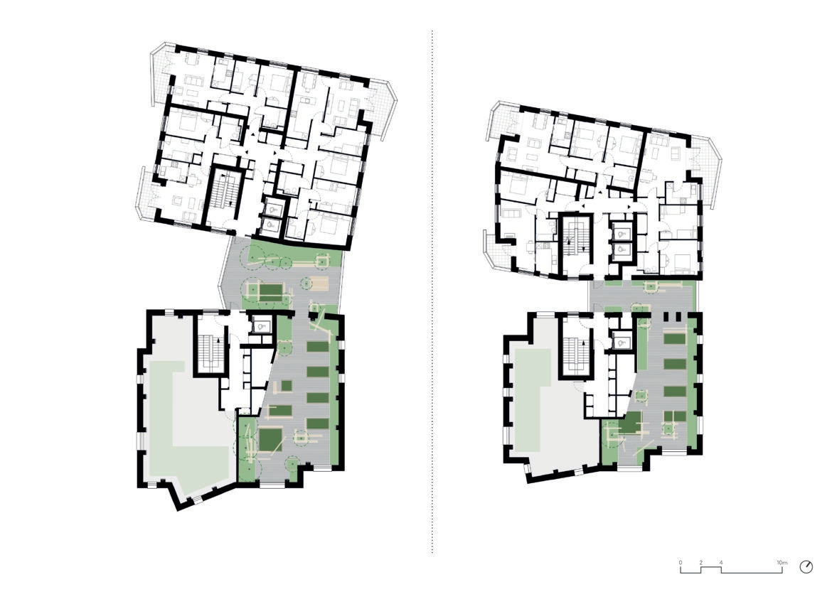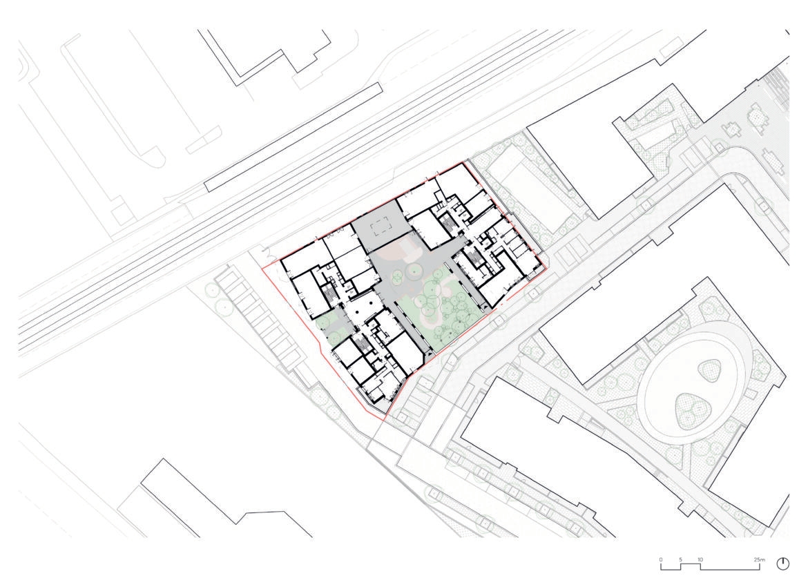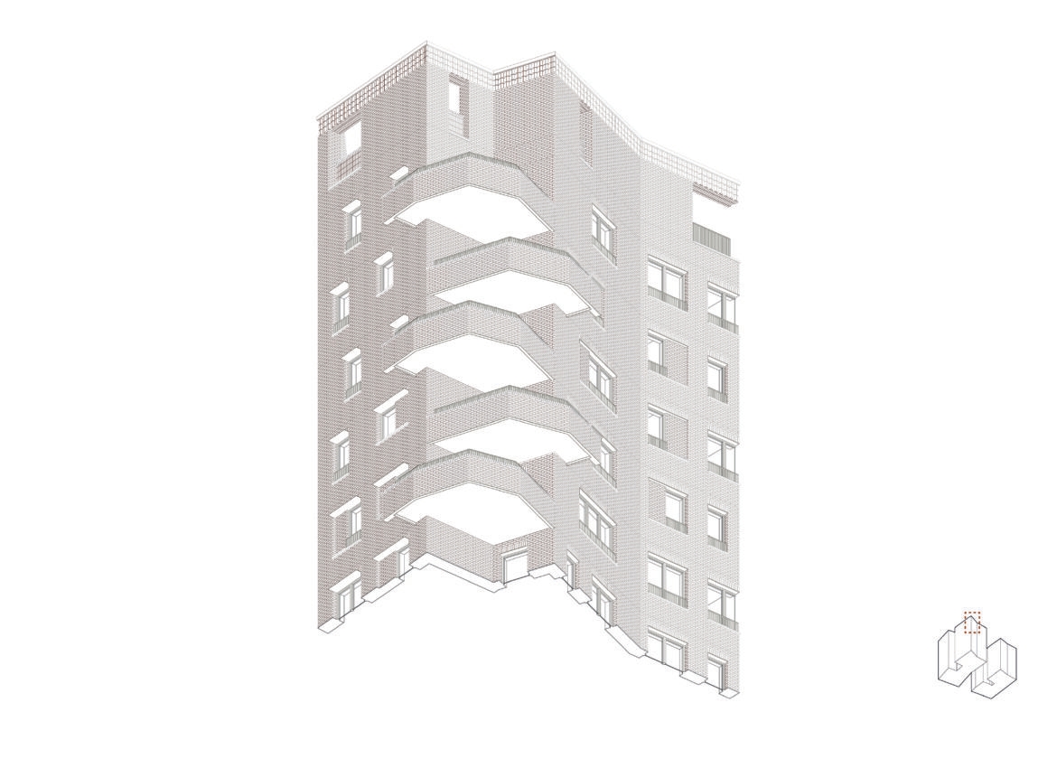 At street level, a generous sequence of amenity spaces, including a new TRA meeting hall, welcomes residents through an architectural colonnade, guiding the route to communal entrances and creating an everyday connection to nature.