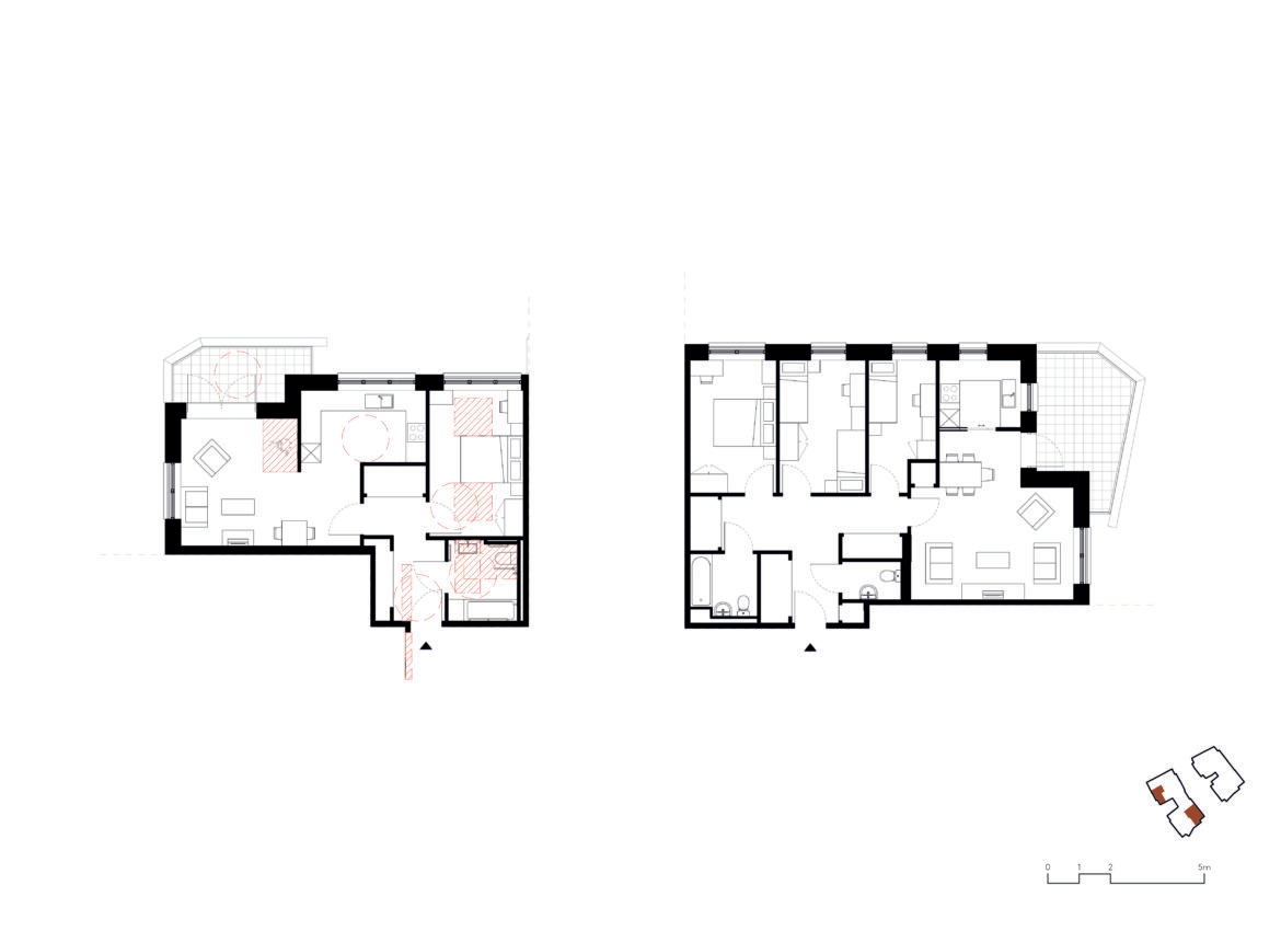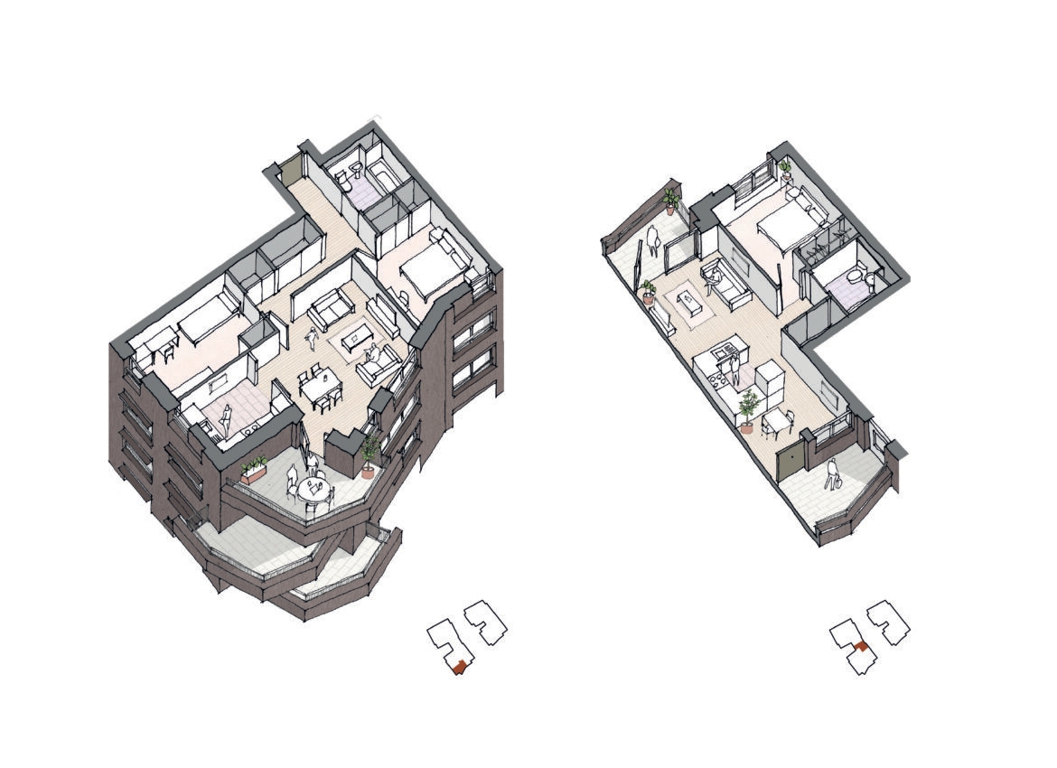 Unit plan axonometrics showing 2b4p and 1b2p social rent homes
