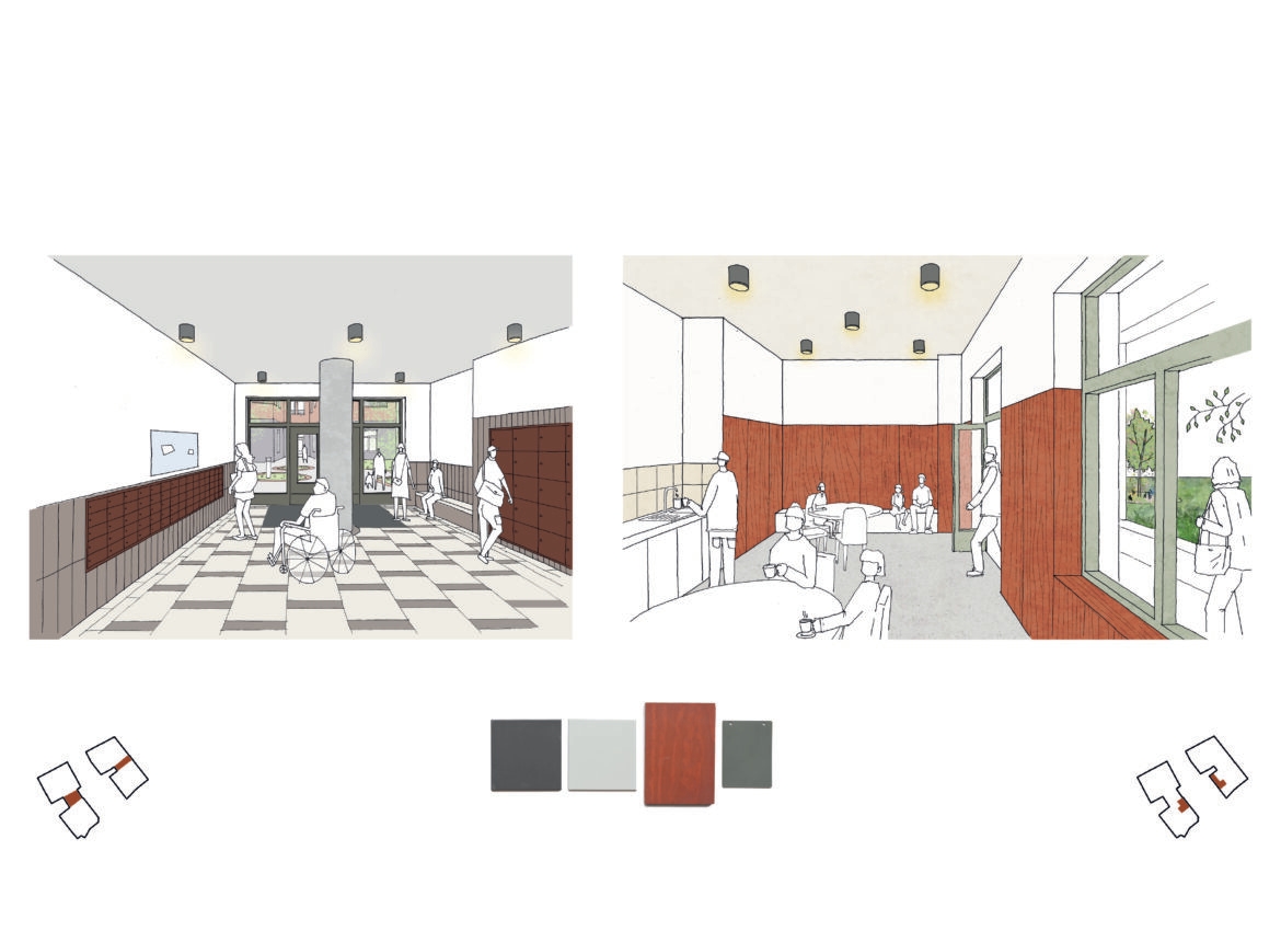 B1 communal lobbies (left) and resident meeting rooms (right) with internal material palette