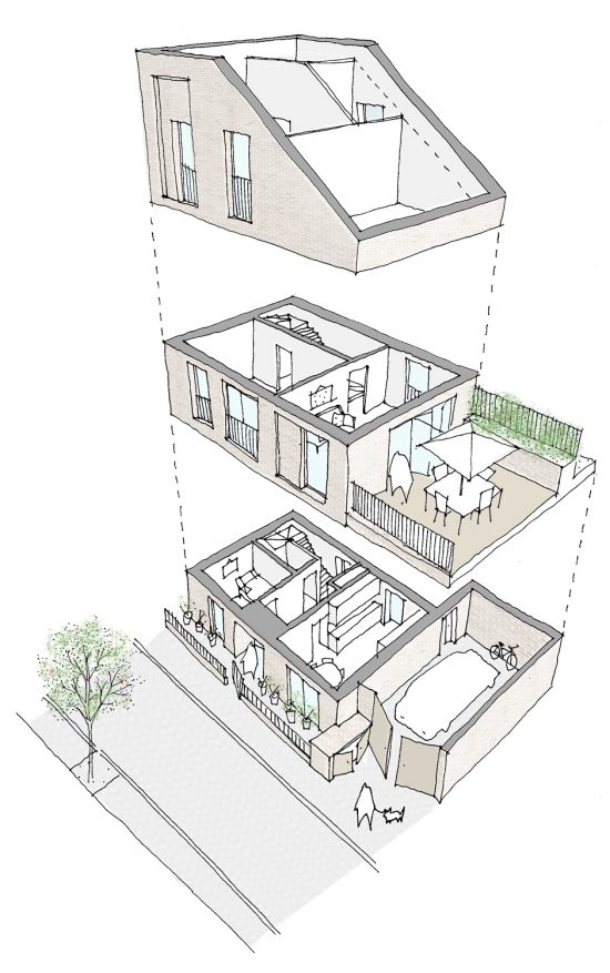 Our design unlocks a narrow, rectangular plot of brownfield land between the Oasis Academy School and a nearby suburban neighbourhood and creates 38 homes of differing typologies arranged in two terraces to create a new street through the site, re-linking important pedestrian connections between north and south and establishing a layout that encourages chance encounters and neighbourliness.