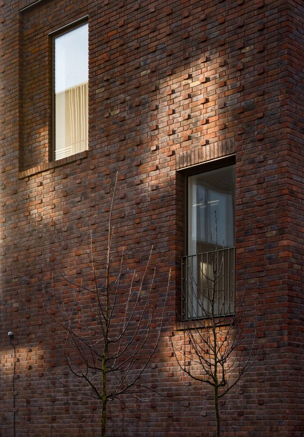 Owing to site restraints, the east terrace features a set of uniquely slim family homes that are orientated west to the street with private first floor terraces facing to the south, creating an arrangement where space is not compromised and no habitable rooms overlook the neighbouring school. Townhouses featuring pitched and mono-pitched roofs create an articulated and varied street profile, allowing daylight to flood the public realm. Internally, all homes are designed to be spacious and adaptable, with substantial floor-to-ceiling heights and ample natural light and ventilation.
