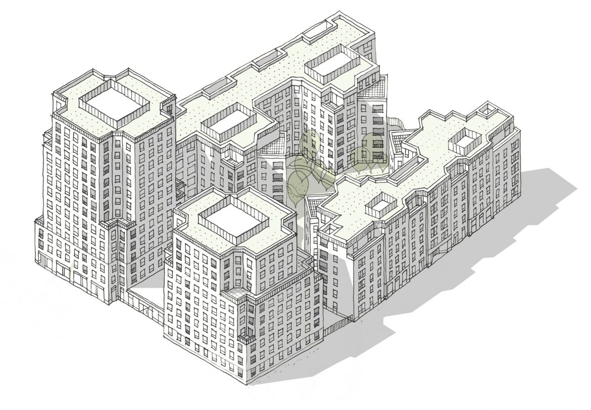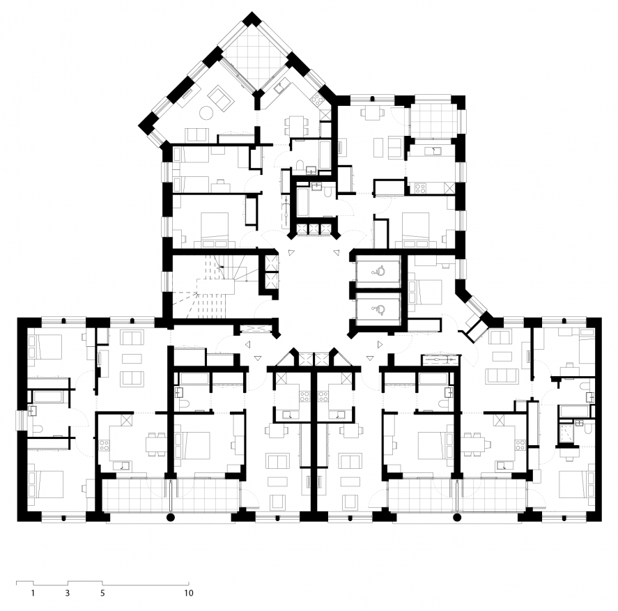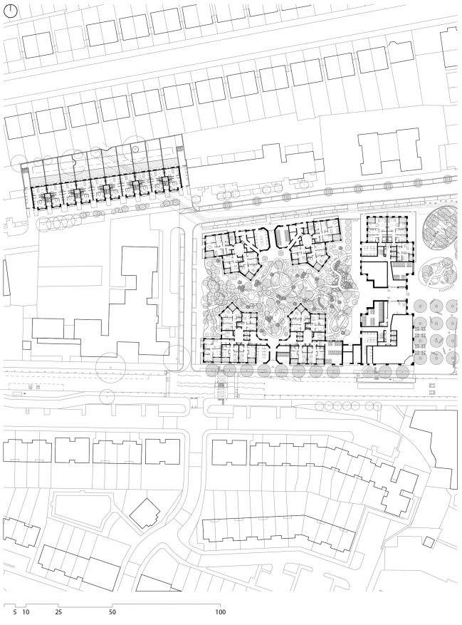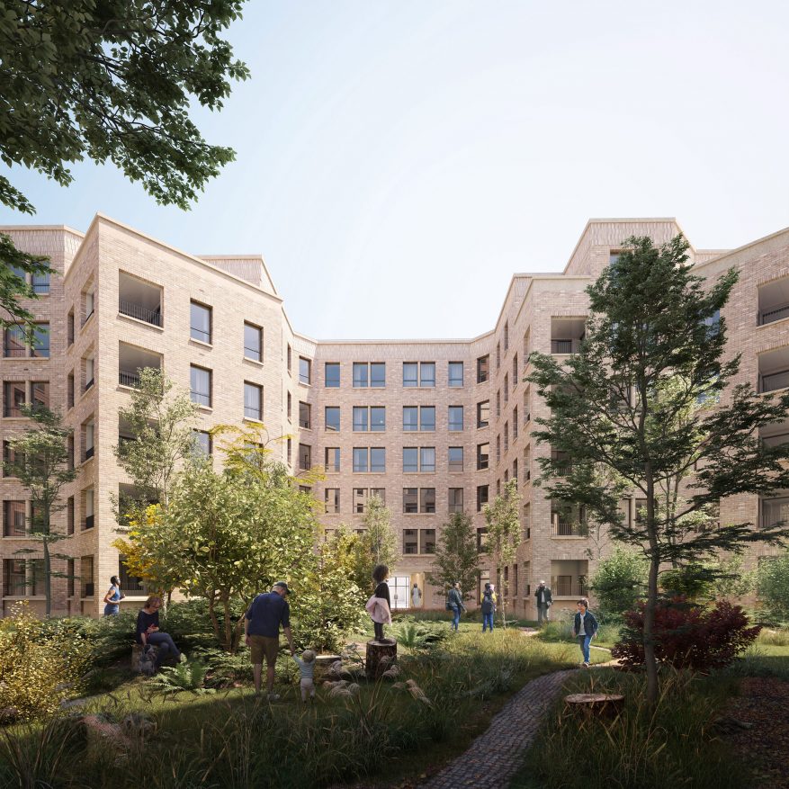 At the centre of the site, two mansion block buildings work with the taller elements to enclose a meandering communal landscape with a set of protrusions that extend out from the buildings on either side to enable an increased density and variety of living spaces through purposeful offsets and alignments.