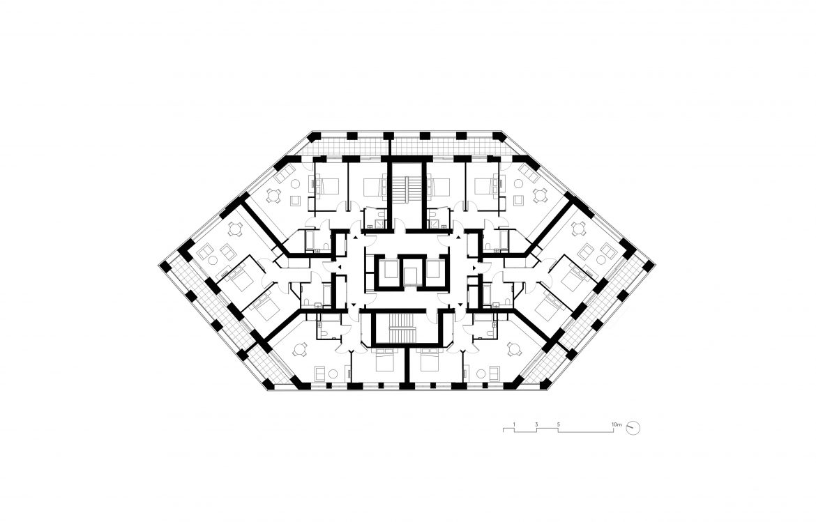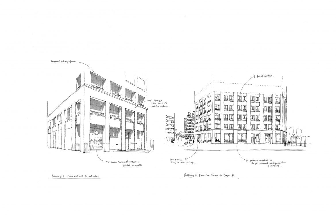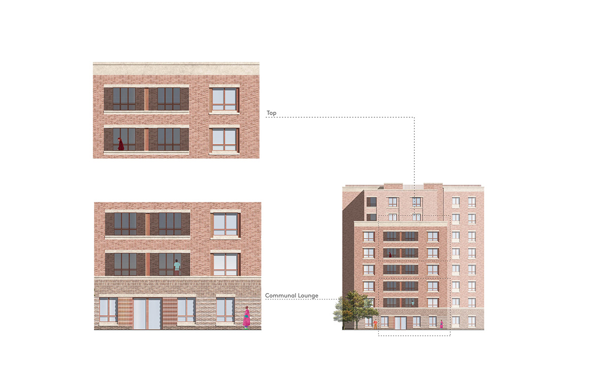 A 20-storey building crafted in warm domestic brick tones addresses the busy Steyne Road to the east containing a mix of 1,2 and 3-bedroom dual-aspect dwellings and a double-height communal lobby located at ground floor. The orientation and shape of this taller building responds to the scale and alignments of the existing estate block to optimise aspect, light and views, while minimising overlooking between the two. Open recessed balconies are carved out on alternate facades, forming an ordered rhythm of open and closed sides which are intentionally off-set with the existing block. These sculptural qualities are carried across the elevations through the presence of deep-set windows and crisp pre-casting detailing which will animate the building with light and shadow throughout the day.