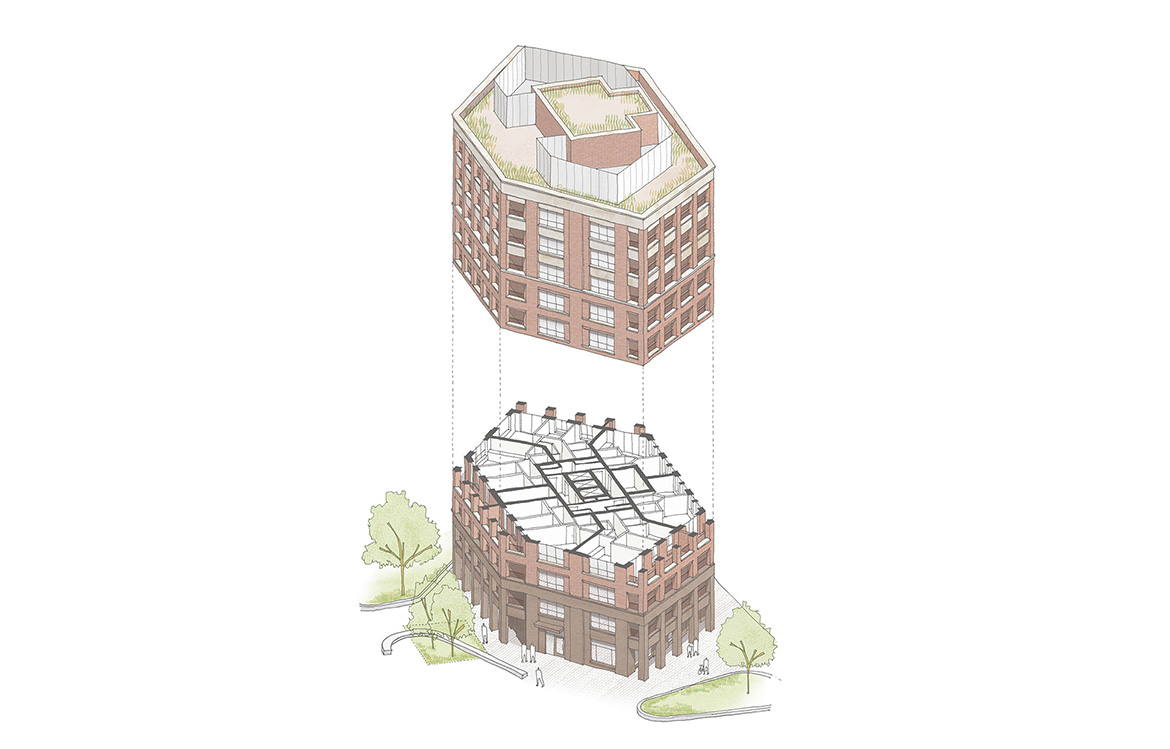 In addition to the creation of new homes, our designs have explored options to re-purpose the large undercrofts of the existing estate buildings with new civic uses to create a more active relationship with the ground floor and public realm. Across the site, new and retained buildings are united within a multi-generational play landscape featuring a network of connecting pedestrian paths and existing mature trees.