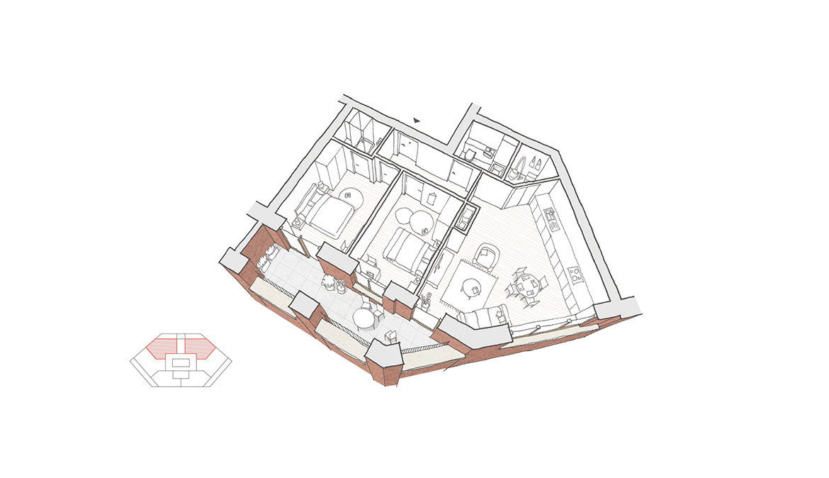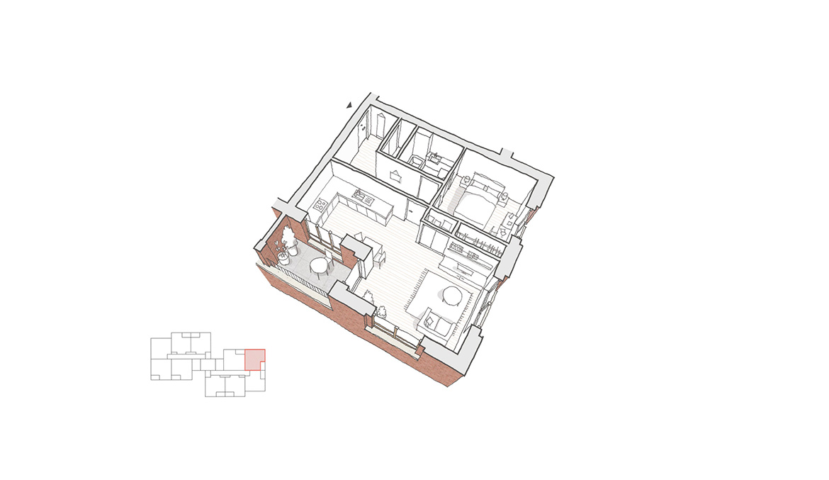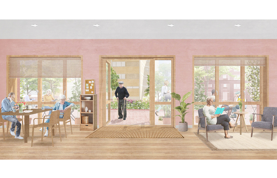 To the east, a building for older adults shares a similar material language and features individual architectural elements including centrally paired balconies that recall the character of nearby homes. Internal layouts are designed to promote a sense of comfort, safety and wellbeing for residents; communal entrances are arranged to frame views into an enclosed courtyard garden, and a triple-aspect communal lounge connects through to a shared outdoor terrace, promoting interactions with neighbours and the outdoors. Spacious family dwellings are contained within a block to the west; placed above a landscaped podium to negotiate a 4m level change and create a better relationship with the street. To reduce energy consumption and keep fuel bills low, the design incorporates a number of passive measures including thermally-efficient fabric and naturally ventilated spaces.