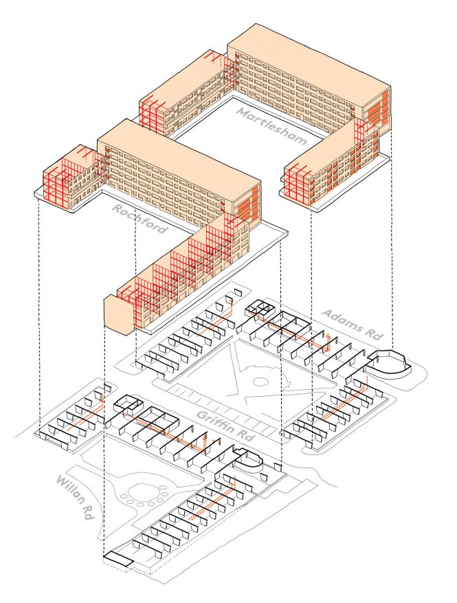 Originally built in the 1960s, Martlesham and Rochford are two large-panel-system (LPS) buildings which have undergone significant alterations over the last three decades, resulting in buildings which are physically layered, poorly insulated and lack a coherent identity. Critically, these original buildings were also found to contain deep-rooted structural and material risks which, despite a long programme of remedial works, still require considered resolution to bring them up to standard.