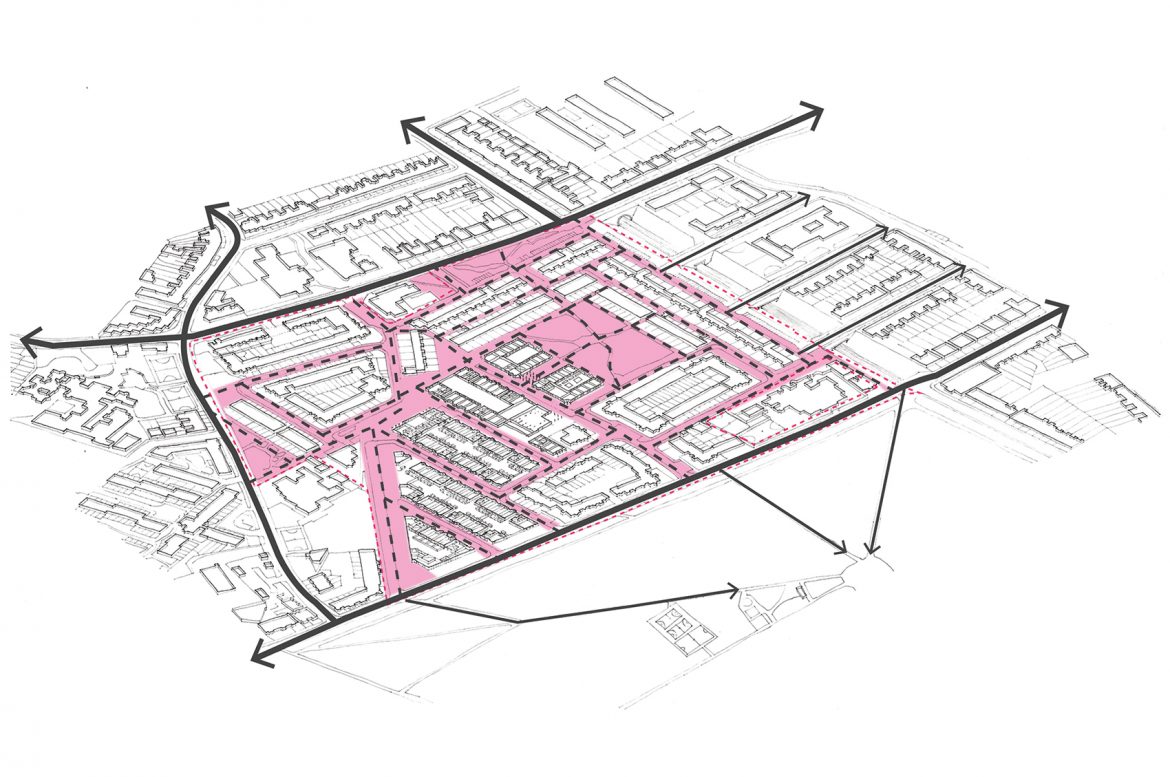 low-density homes. As a result of these changes, a collection of disparate elements emerged, with mixed building types and large unresolved and demolished areas.