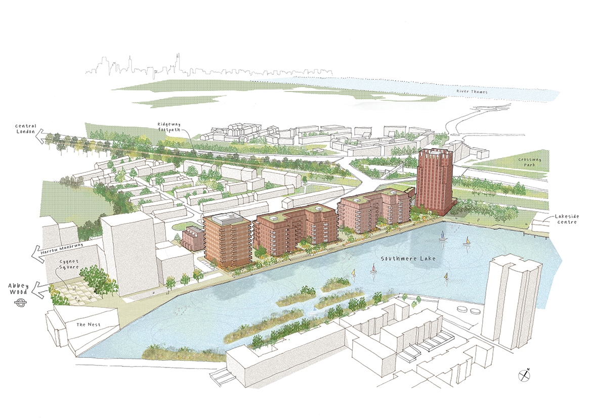 Located on the western edge of Southmere Lake in south-east London at the intersection of major urban infrastructure, our proposals for South Thamesmead (Phase 2) form part of the wide reaching and ambitious masterplan strategy shaping this part of the city. Our scheme creates a mixed-tenure neighbourhood of 329 homes, including 59 affordable rent homes for returning Thamesmead residents reflecting the qualities and characteristics of its varied setting.