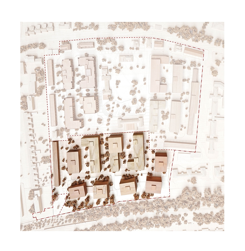 In the site’s southwestern corner, a public square and commercial unit greet a new pedestrian and cycle through-route to Warwick Gardens and the high street amenities and transport links of Green Lanes beyond. This new route will provide permeability through this previously isolated hospital site for the wider community, ensuring that the new development is an integrated part of the city as well as improving neighbourhood-wide active travel connections.