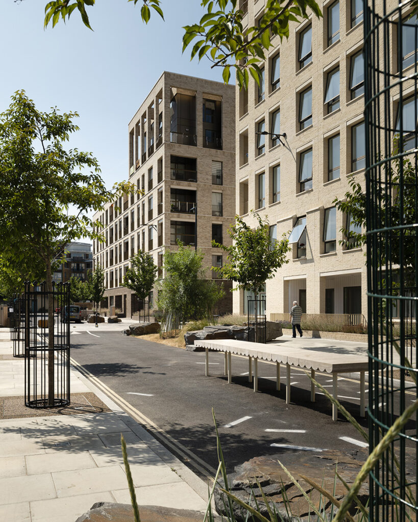 The main articulation of the new neighbourhood however is its central east-west street – a linear axis designed to open up the estate and improve connectivity to adjacent amenities, but also be a civic space in itself – a sociable, active and consciously playful space to linger rather than simply pass through. The traffic-free space is lined with trees and is full of new planting and playful installations to encourage imaginative responses from people of all ages, including a huge table for impromptu open-air gatherings. Supporting the life of the space, front doors and the communal entrances to the new buildings all open out onto the space ensuring regular use by and visibility of the community. The generous high-ceilinged lobbies feature large openings that provide views from the street through to the courtyard landscapes. Elsewhere, non-residential uses at ground level at key locations, such as retail and community use, brings activity to occupy and spill out into this public realm.