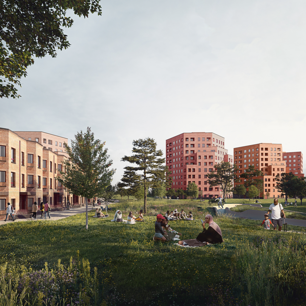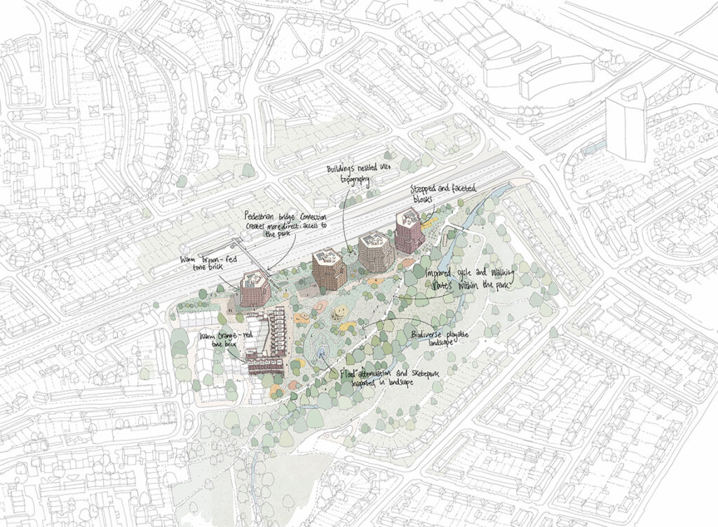 Conceived as elements nestled within topography, the three new landscape-led apartment buildings will directly balance loss of space, by introducing new activity, with new homes providing new life and contributing to physical park improvements that will increase safety with new pathways and new lighting, promote biodiversity through new wild flower meadows and planting, support resilience through the addition of flood attenuation basins and promote new use through growing spaces, seating areas and play amenities including an outdoor gym and skate park.