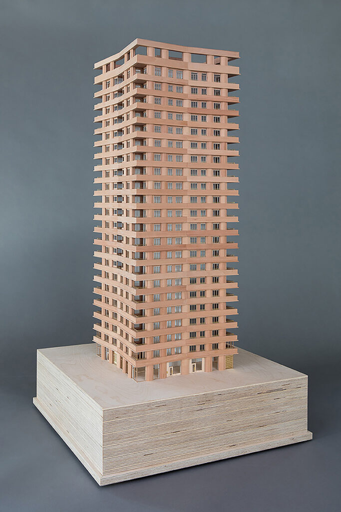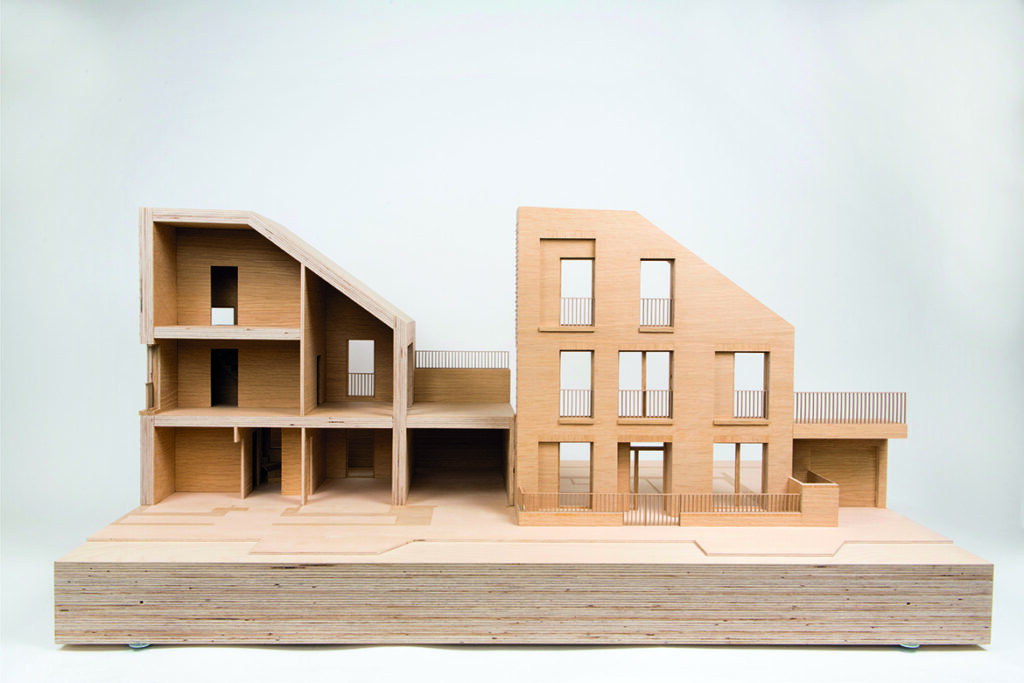 As a studio with a focus on housing, communicating the internal logic of a building or dwelling is key. In this instance, large 1:50 or 1:25 models are created, which means that people can get up close and start to understand living spaces and circulation. Borrowing from the purpose and style of the exploded axonometric or sectional drawing, the cutaway model can further an understanding of structure and communicate multiple issues and perspectives, enabling viewers to see, for example, the relationship between an undulating elevation the balcony or winter garden and the dwelling behind.