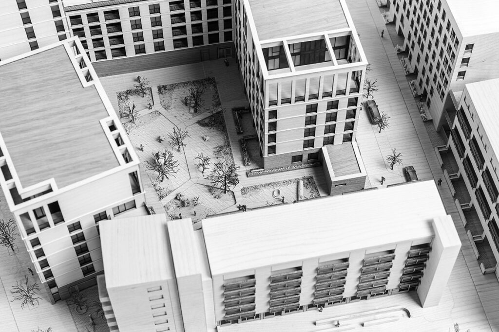 In later phases of the design process, models in the studio are often built to communicate, building form, design quality and detail. Zooming in to 1:250, the model for Kings Crescent Estate Phases 1 and 2 was produced out of fine laser-cut birch and maple veneers. The material quality and craft of the model helped to communicate the final building design and masterplan to the council and residents in an engaging and warm resident friendly manner. Animated public realm, streetscapes and play areas with figures added a light-hearted and instantly recognisable human scale to proposals, tacitly conveying the building design and its relation to the wider masterplan and its adjacent streets.